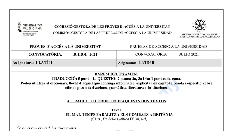 Examen PAU Latín II selectividad C. Valenciana — Ordinaria 2021