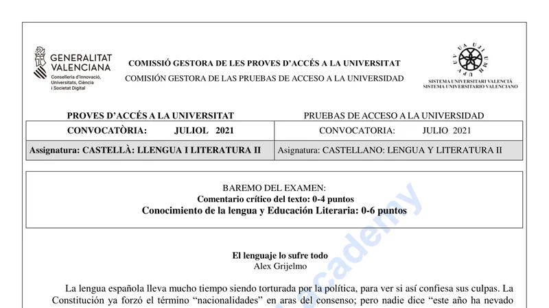 Examen PAU Lengua Castellana selectividad C. Valenciana — Extraordinaria 2021