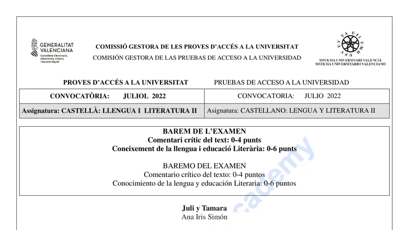 Reservar clase gratis →Examen de Lengua Castellana y Literatura selectividad C. Valenciana (Ordinaria 2022)