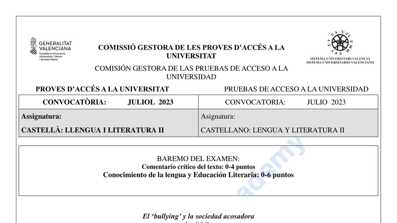 Reservar clase gratis →Examen de Lengua Castellana y Literatura selectividad C. Valenciana (Ordinaria 2023)