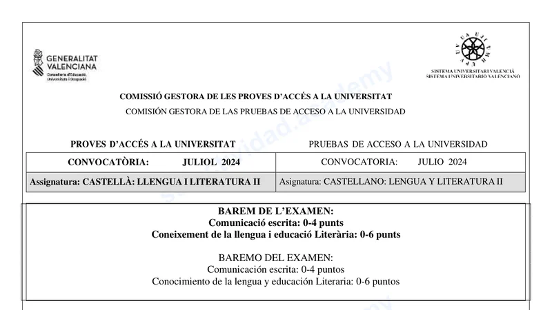 Examen de Lengua Castellana selectividad C. Valenciana — Extraordinaria 2024