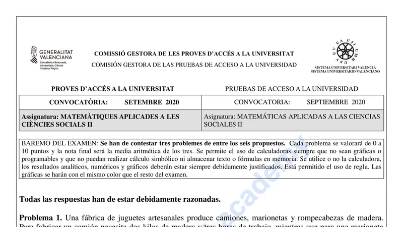 Reservar clase gratis →Examen de Matemáticas CCSS selectividad C. Valenciana (Extraordinaria 2020)
