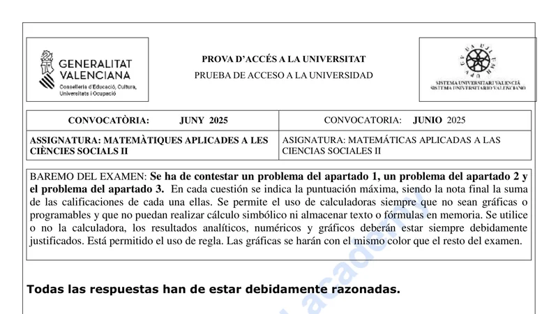 Reservar clase gratis →Examen de Matemáticas Aplicadas CCSS selectividad C. Valenciana (Ordinaria 2025)