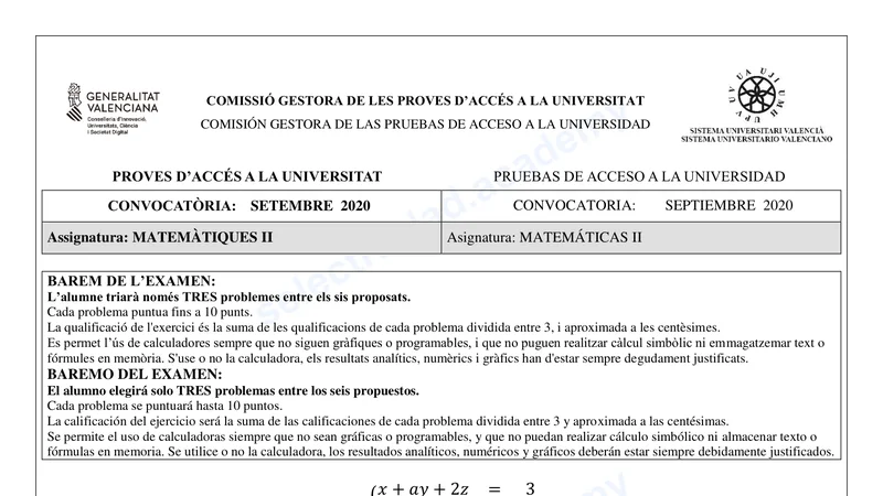 Enunciado oficial del examen de Matemáticas II de la convocatoria extraordinaria de 2020 de la PAU de C. Valenciana. PDF de 0.3 MB. Descarga gratuita y sin registro. ¿Preparando la selectividad? Calcula tu nota estimada o consulta la guía completa de selectividad 2026. Encuentra todos los exámenes de Matemáticas II en C. Valenciana o explora las 17 comunidades autónomas.