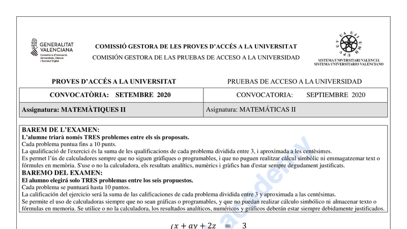 Reservar clase gratis →Examen de Matemáticas II selectividad C. Valenciana (Ordinaria 2020)