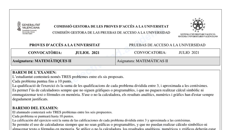 Examen PAU Matemáticas II selectividad C. Valenciana — Extraordinaria 2021