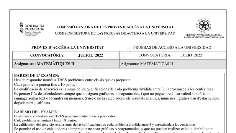 Enunciado oficial del examen de Matemáticas II de la convocatoria extraordinaria de 2022 de la PAU de C. Valenciana. PDF de 0.3 MB. Descarga gratuita y sin registro. ¿Preparando la selectividad? Calcula tu nota estimada o consulta la guía completa de selectividad 2026. Encuentra todos los exámenes de Matemáticas II en C. Valenciana o explora las 17 comunidades autónomas.