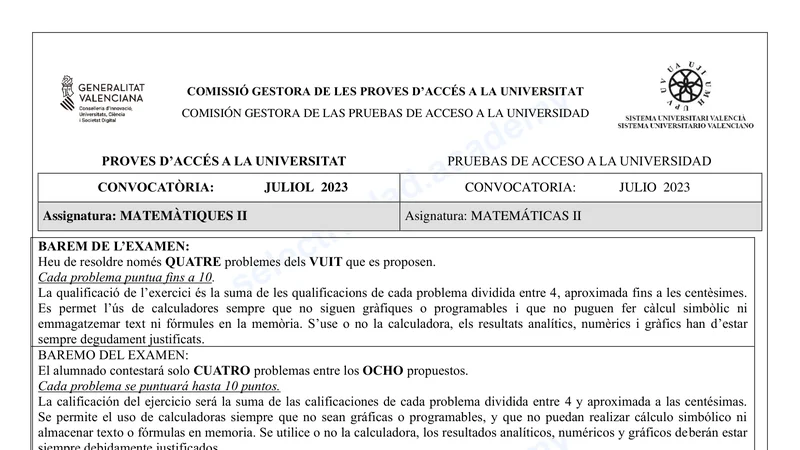 Reservar clase gratis →Examen de Matemáticas II selectividad C. Valenciana (Extraordinaria 2023)