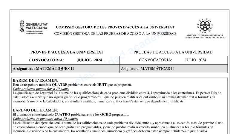 Reservar clase gratis →Examen de Matemáticas II selectividad C. Valenciana (Extraordinaria 2024)