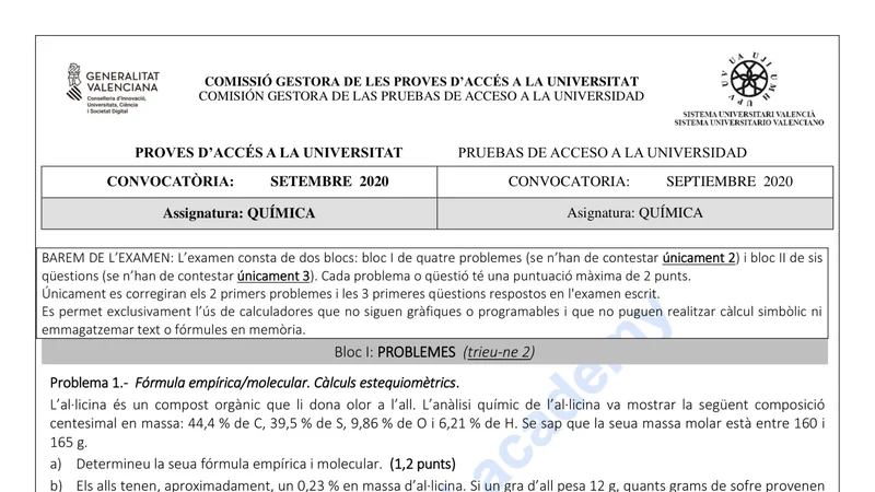 Examen PAU Química selectividad C. Valenciana — Ordinaria 2020