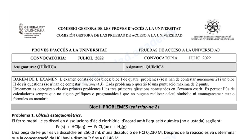 Enunciado oficial del examen de Química de la convocatoria extraordinaria de 2022 de la PAU de C. Valenciana. PDF de 0.8 MB. Descarga gratuita y sin registro. ¿Preparando la selectividad? Calcula tu nota estimada o consulta la guía completa de selectividad 2026. Encuentra todos los exámenes de Química en C. Valenciana o explora las 17 comunidades autónomas.