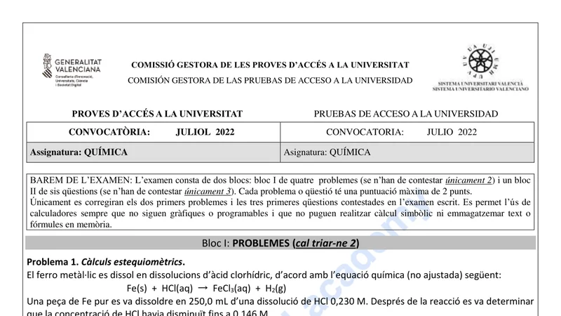 Reservar clase gratis →Examen de Química selectividad C. Valenciana (Ordinaria 2022)