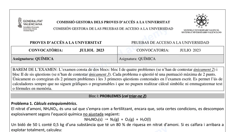 Reservar clase gratis →Examen de Química selectividad C. Valenciana (Extraordinaria 2023)
