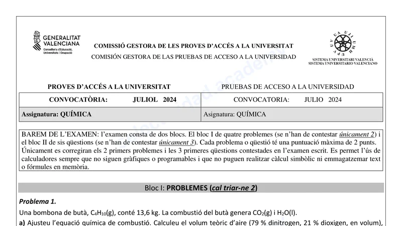 Reservar clase gratis →Examen de Química selectividad C. Valenciana (Extraordinaria 2024)