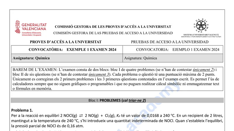 Reservar clase gratis →Examen de Química selectividad C. Valenciana (Ordinaria 2024)