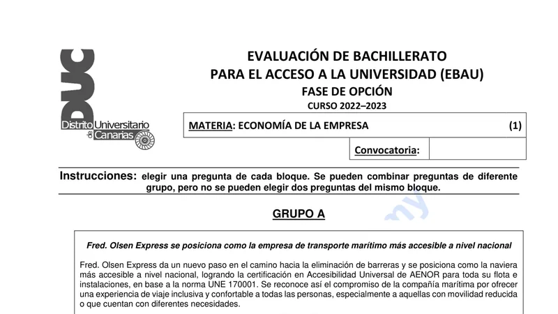 Enunciado oficial del examen de Economía de la Empresa de la convocatoria extraordinaria de 2023 de la EBAU/PAU de Canarias. PDF de 0.8 MB. Descarga gratuita y sin registro. ¿Preparando la selectividad? Calcula tu nota estimada o consulta la guía completa de selectividad 2026. Encuentra todos los exámenes de Economía de la Empresa en Canarias o explora las 17 comunidades autónomas.