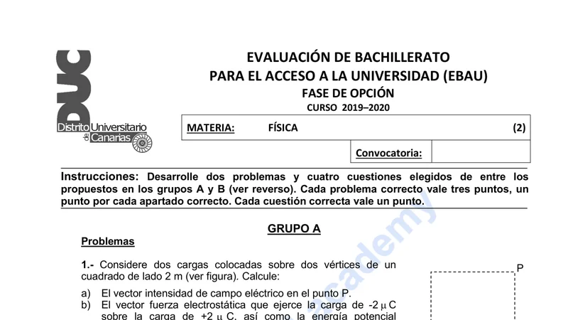 Enunciado oficial del examen de Física de la convocatoria extraordinaria de 2020 de la EBAU/PAU de Canarias. PDF de 0.6 MB. Descarga gratuita y sin registro. ¿Preparando la selectividad? Calcula tu nota estimada o consulta la guía completa de selectividad 2026. Encuentra todos los exámenes de Física en Canarias o explora las 17 comunidades autónomas.