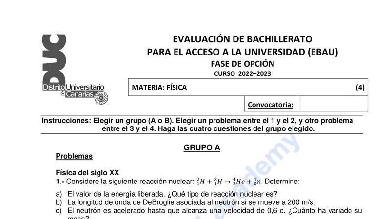 Enunciado oficial del examen de Física de la convocatoria ordinaria de 2023 de la EBAU/PAU de Canarias. PDF de 0.2 MB. Descarga gratuita y sin registro. ¿Preparando la selectividad? Calcula tu nota estimada o consulta la guía completa de selectividad 2026. Encuentra todos los exámenes de Física en Canarias o explora las 17 comunidades autónomas.