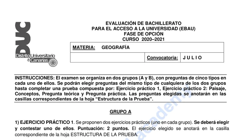Enunciado oficial del examen de Geografía de la convocatoria extraordinaria de 2021 de la EBAU/PAU de Canarias. PDF de 1.3 MB. Descarga gratuita y sin registro. ¿Preparando la selectividad? Calcula tu nota estimada o consulta la guía completa de selectividad 2026. Encuentra todos los exámenes de Geografía en Canarias o explora las 17 comunidades autónomas.