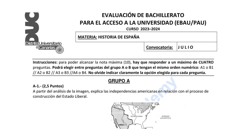 Reservar clase gratis →Examen de Historia de España selectividad Canarias (Extraordinaria 2024)