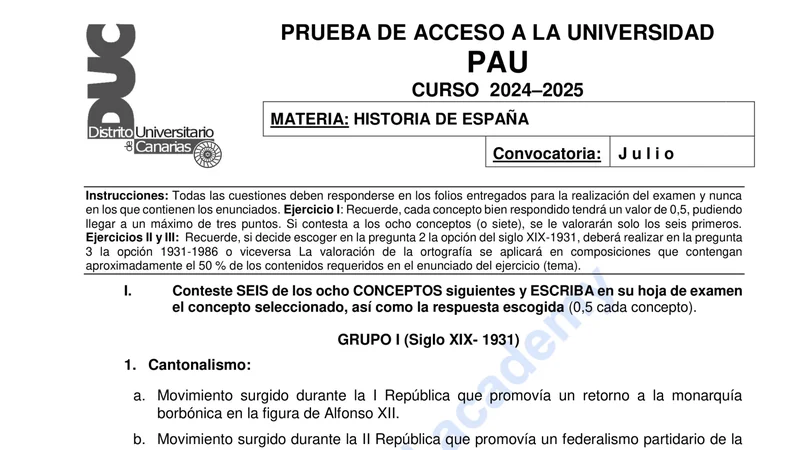Reservar clase gratis →Examen de Historia de España selectividad Canarias (Extraordinaria 2025)