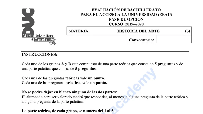 Examen de Historia del Arte selectividad Canarias — Ordinaria 2020
