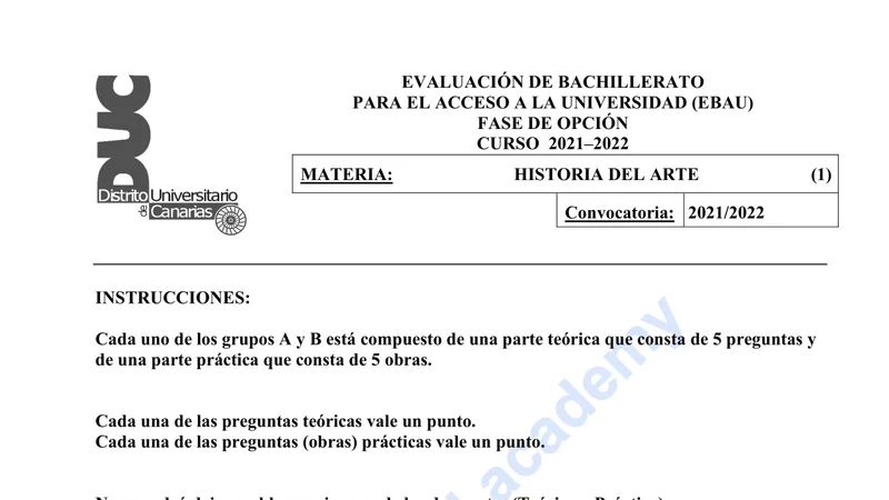 Enunciado oficial del examen de Historia del Arte de la convocatoria extraordinaria de 2022 de la EBAU/PAU de Canarias. PDF de 0.7 MB. Descarga gratuita y sin registro. ¿Preparando la selectividad? Calcula tu nota estimada o consulta la guía completa de selectividad 2026. Encuentra todos los exámenes de Historia del Arte en Canarias o explora las 17 comunidades autónomas.