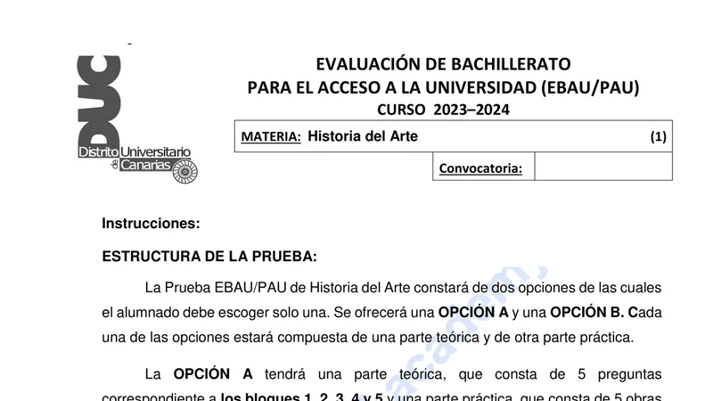 Enunciado oficial del examen de Historia del Arte de la convocatoria ordinaria de 2024 de la EBAU/PAU de Canarias. PDF de 0.8 MB. Descarga gratuita y sin registro. ¿Preparando la selectividad? Calcula tu nota estimada o consulta la guía completa de selectividad 2026. Encuentra todos los exámenes de Historia del Arte en Canarias o explora las 17 comunidades autónomas.