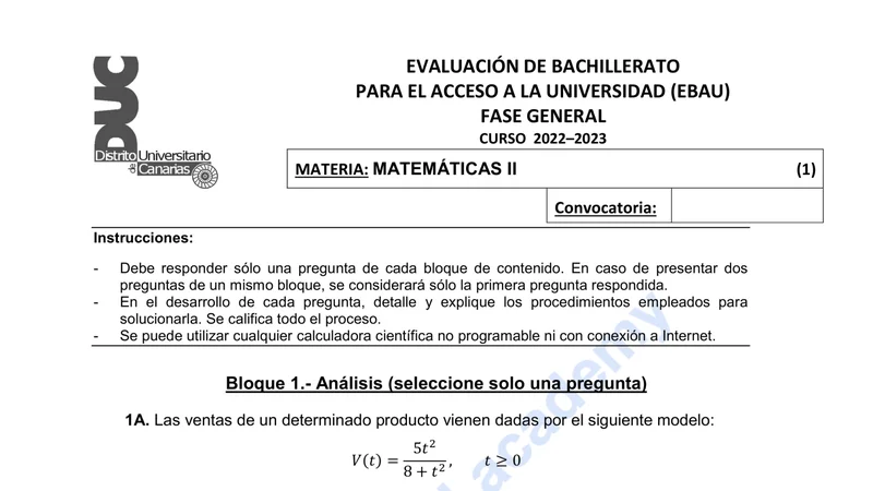 Enunciado oficial del examen de Matemáticas II de la convocatoria extraordinaria de 2023 de la EBAU/PAU de Canarias. PDF de 0.3 MB. Descarga gratuita y sin registro. ¿Preparando la selectividad? Calcula tu nota estimada o consulta la guía completa de selectividad 2026. Encuentra todos los exámenes de Matemáticas II en Canarias o explora las 17 comunidades autónomas.