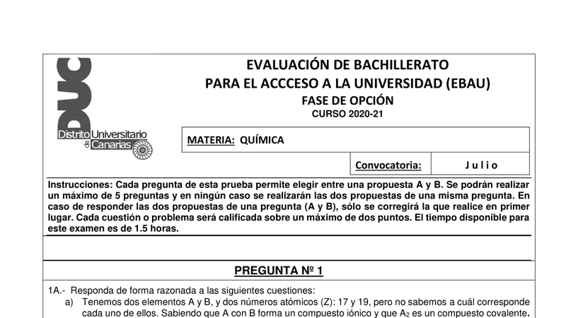 Enunciado oficial del examen de Química de la convocatoria extraordinaria de 2021 de la EBAU/PAU de Canarias. PDF de 0.5 MB. Descarga gratuita y sin registro. ¿Preparando la selectividad? Calcula tu nota estimada o consulta la guía completa de selectividad 2026. Encuentra todos los exámenes de Química en Canarias o explora las 17 comunidades autónomas.