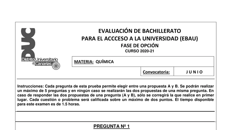 Enunciado oficial del examen de Química de la convocatoria ordinaria de 2021 de la EBAU/PAU de Canarias. PDF de 0.5 MB. Descarga gratuita y sin registro. ¿Preparando la selectividad? Calcula tu nota estimada o consulta la guía completa de selectividad 2026. Encuentra todos los exámenes de Química en Canarias o explora las 17 comunidades autónomas.