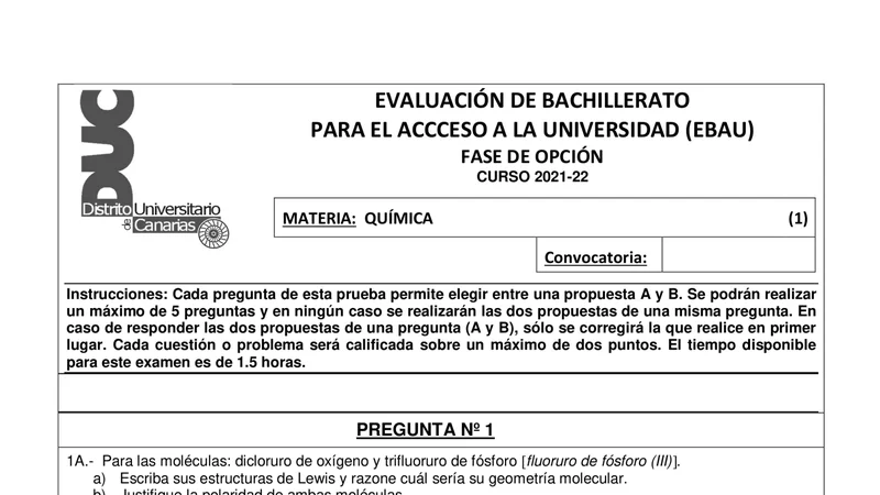 Enunciado oficial del examen de Química de la convocatoria extraordinaria de 2022 de la EBAU/PAU de Canarias. PDF de 0.6 MB. Descarga gratuita y sin registro. ¿Preparando la selectividad? Calcula tu nota estimada o consulta la guía completa de selectividad 2026. Encuentra todos los exámenes de Química en Canarias o explora las 17 comunidades autónomas.