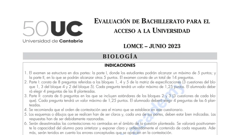 Examen de Biología selectividad Cantabria — Ordinaria 2023