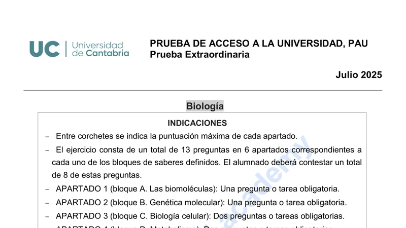 Reservar clase gratis →Examen de Biología selectividad Cantabria (Extraordinaria 2025)