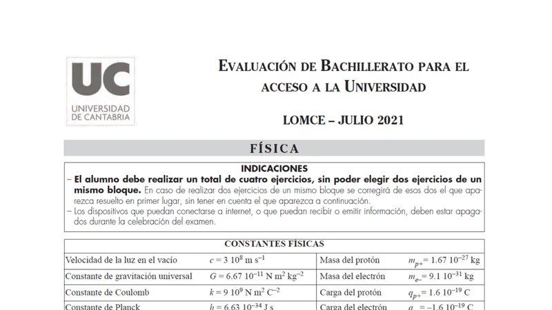 Examen de Física selectividad Cantabria — Extraordinaria 2021