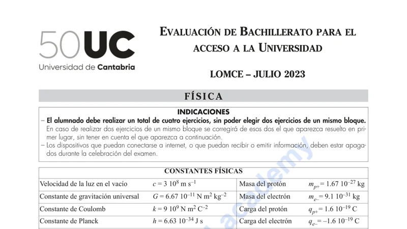 Examen de Física selectividad Cantabria — Extraordinaria 2023