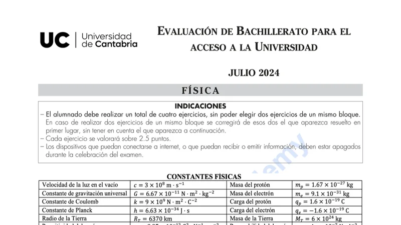 Examen PAU Física selectividad Cantabria — Extraordinaria 2024
