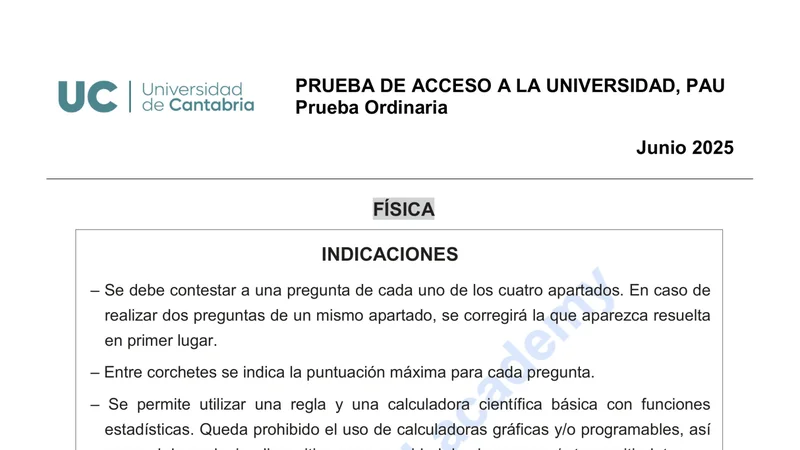 Examen de Física selectividad Cantabria — Ordinaria 2025