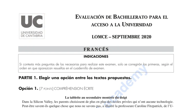 Reservar clase gratis →Examen de Francés selectividad Cantabria (Extraordinaria 2020)