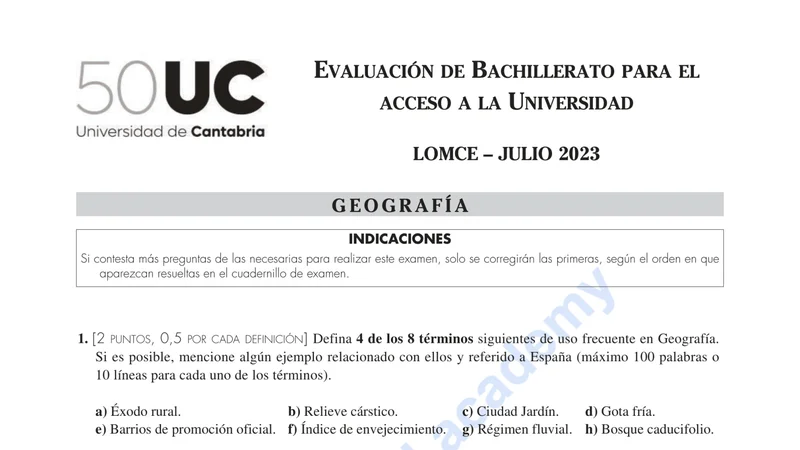Reservar clase gratis →Examen de Geografía selectividad Cantabria (Extraordinaria 2023)