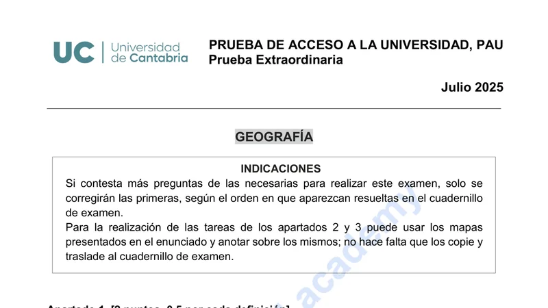 Reservar clase gratis →Examen de Geografía selectividad Cantabria (Extraordinaria 2025)