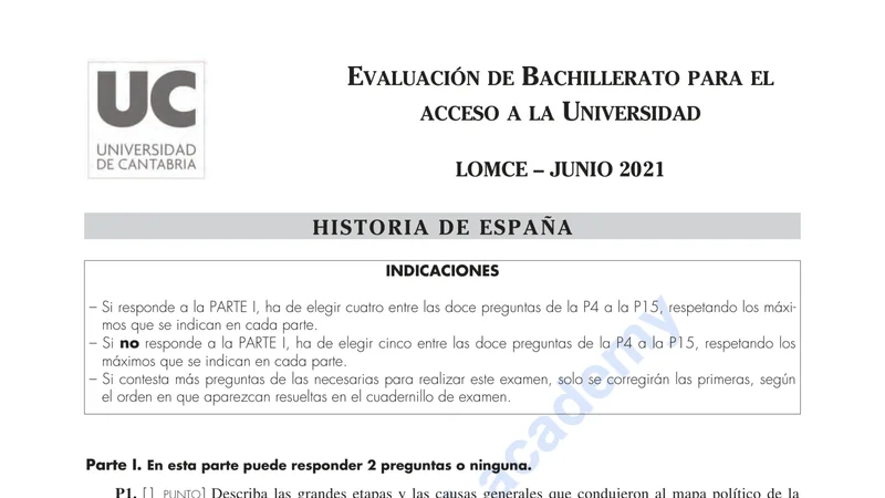 Reservar clase gratis →Examen de Historia de España selectividad Cantabria (Ordinaria 2021)
