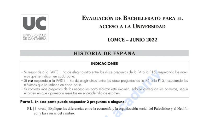 Examen PAU Historia de España selectividad Cantabria — Ordinaria 2022