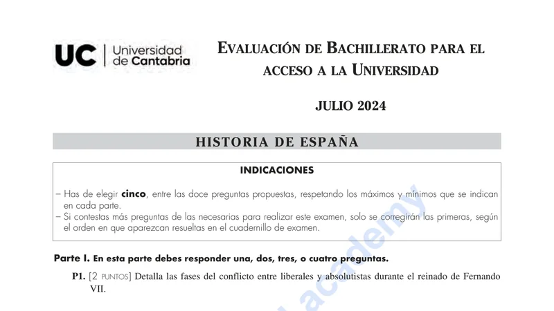 Examen PAU Historia de España selectividad Cantabria — Extraordinaria 2024