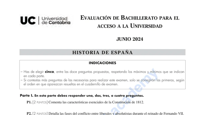 Examen de Historia de España selectividad Cantabria — Ordinaria 2024