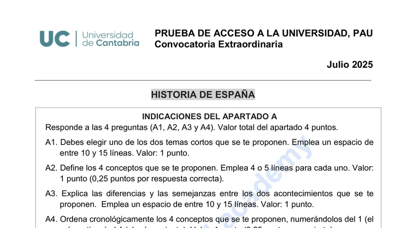 Reservar clase gratis →Examen de Historia de España selectividad Cantabria (Extraordinaria 2025)