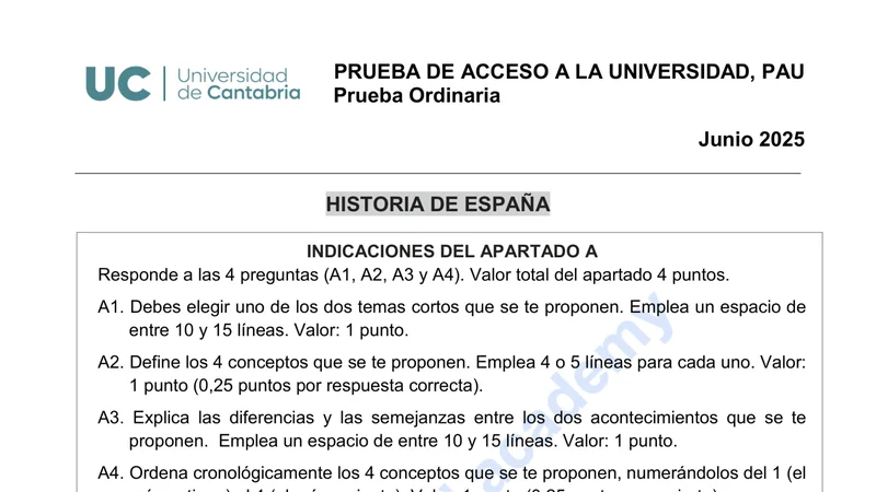 Reservar clase gratis →Examen de Historia de España selectividad Cantabria (Ordinaria 2025)