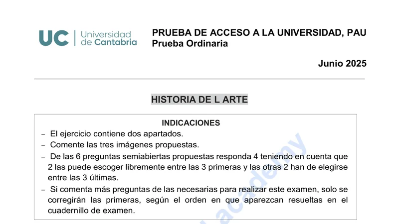 Examen de Historia del Arte selectividad Cantabria — Ordinaria 2025