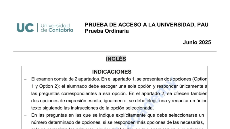 Examen PAU Inglés selectividad Cantabria — Ordinaria 2025