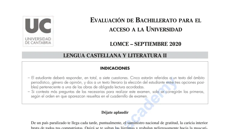 Reservar clase gratis →Examen de Lengua Castellana y Literatura selectividad Cantabria (Extraordinaria 2020)